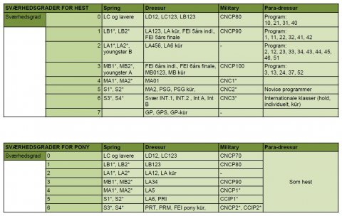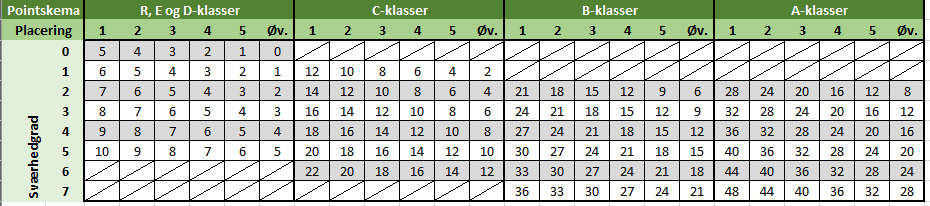 Point for placeringer tildeles efter pointskemaer over niveau for klasse, placering og sværhedsgrad. Øvrige placeringer er efter DRF´s placeringstabel.